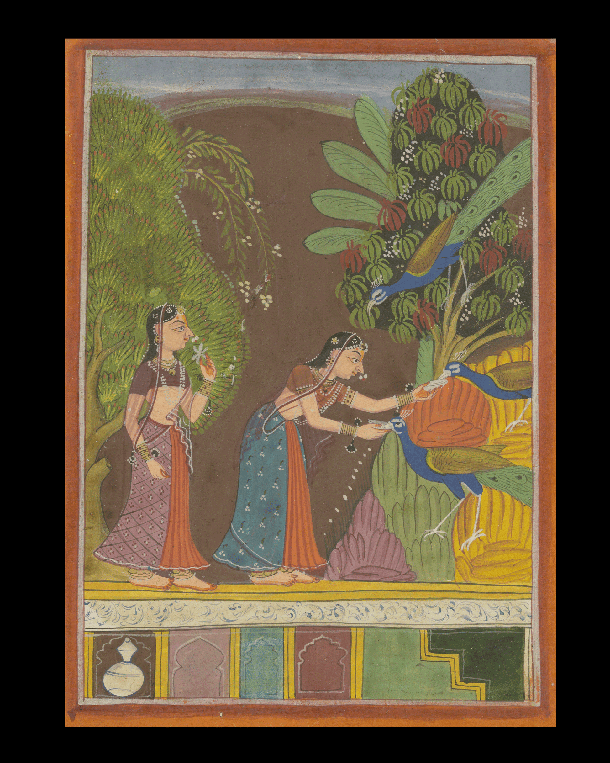Two women stand in a darkly tinted landscape with trees and rocks. The woman in the center feeds two peacocks with fruit from the tree; at the bottom, a border pattern of geometric shapes.