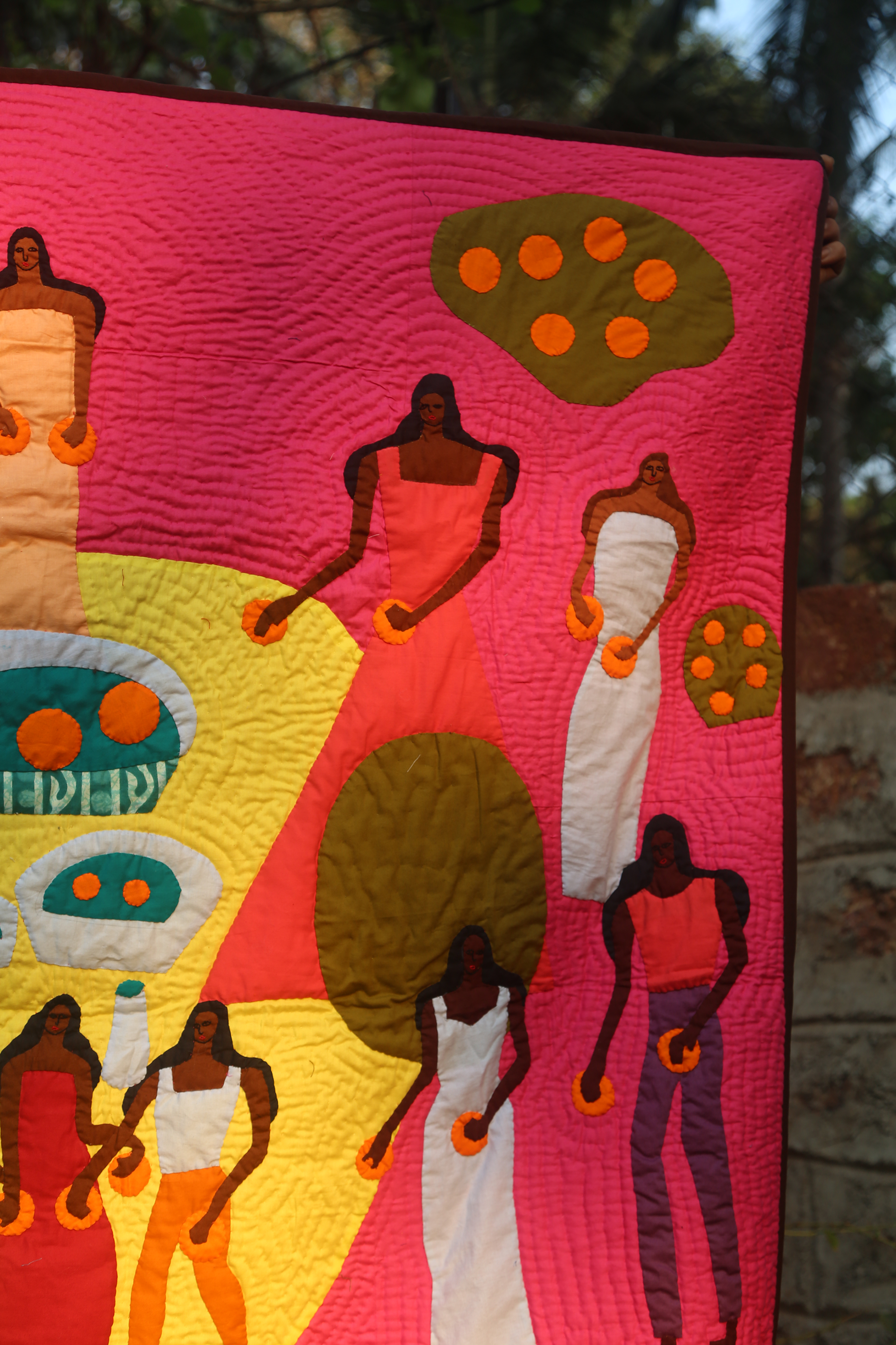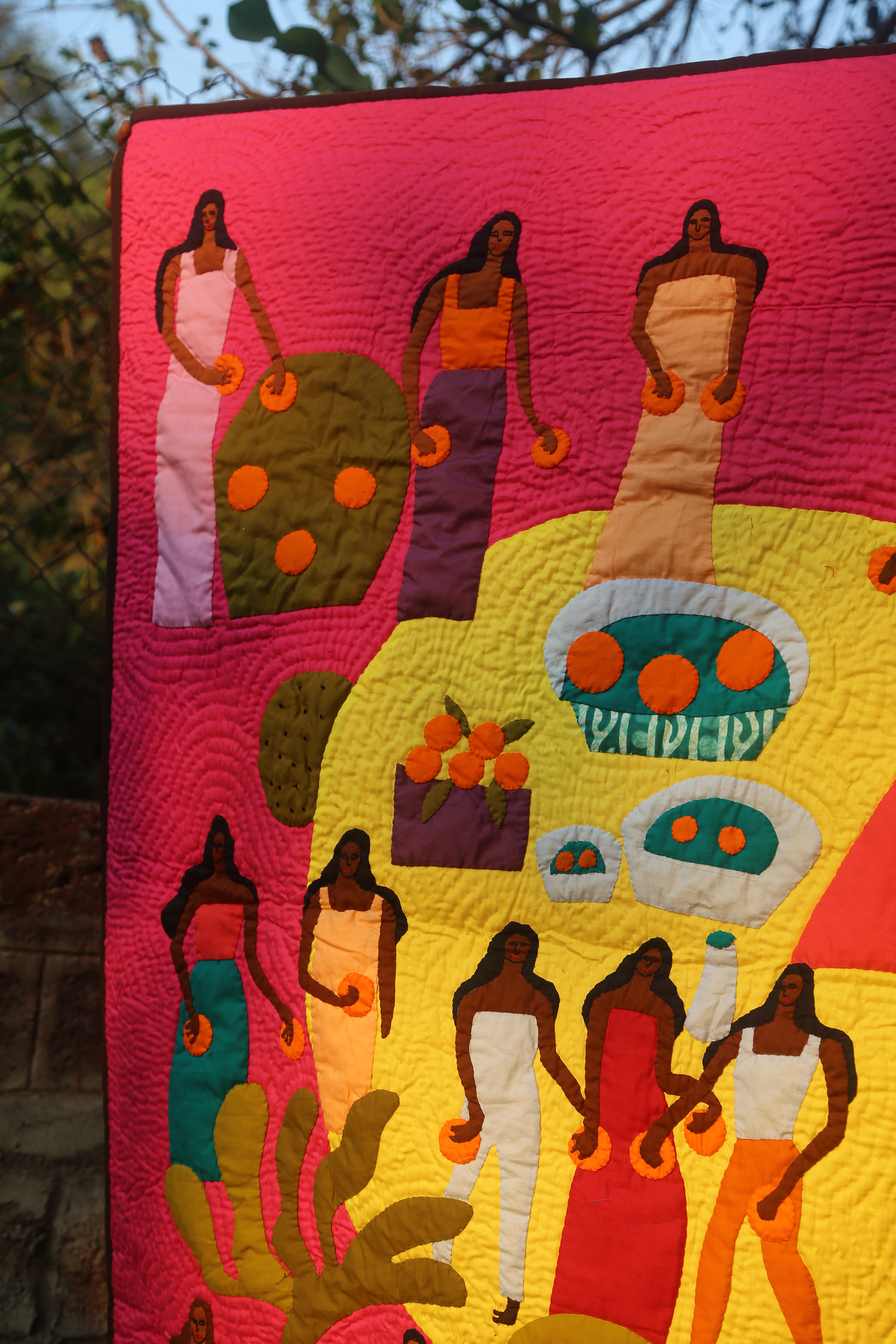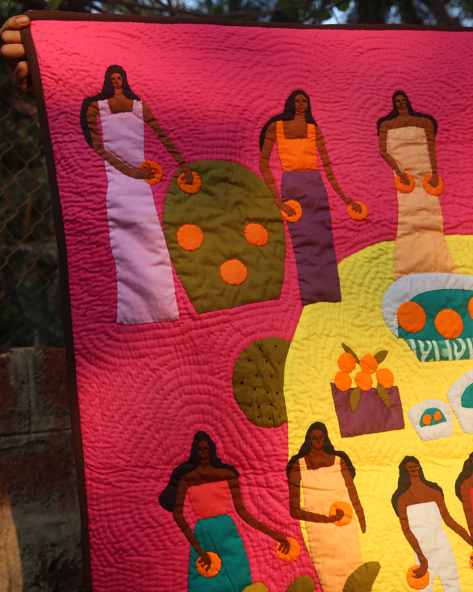 Your beloved Oranges For Everyone artwork as a quilt. Hand crafted by fabric artist Neelam di, in collaboration with Project Purkul.
