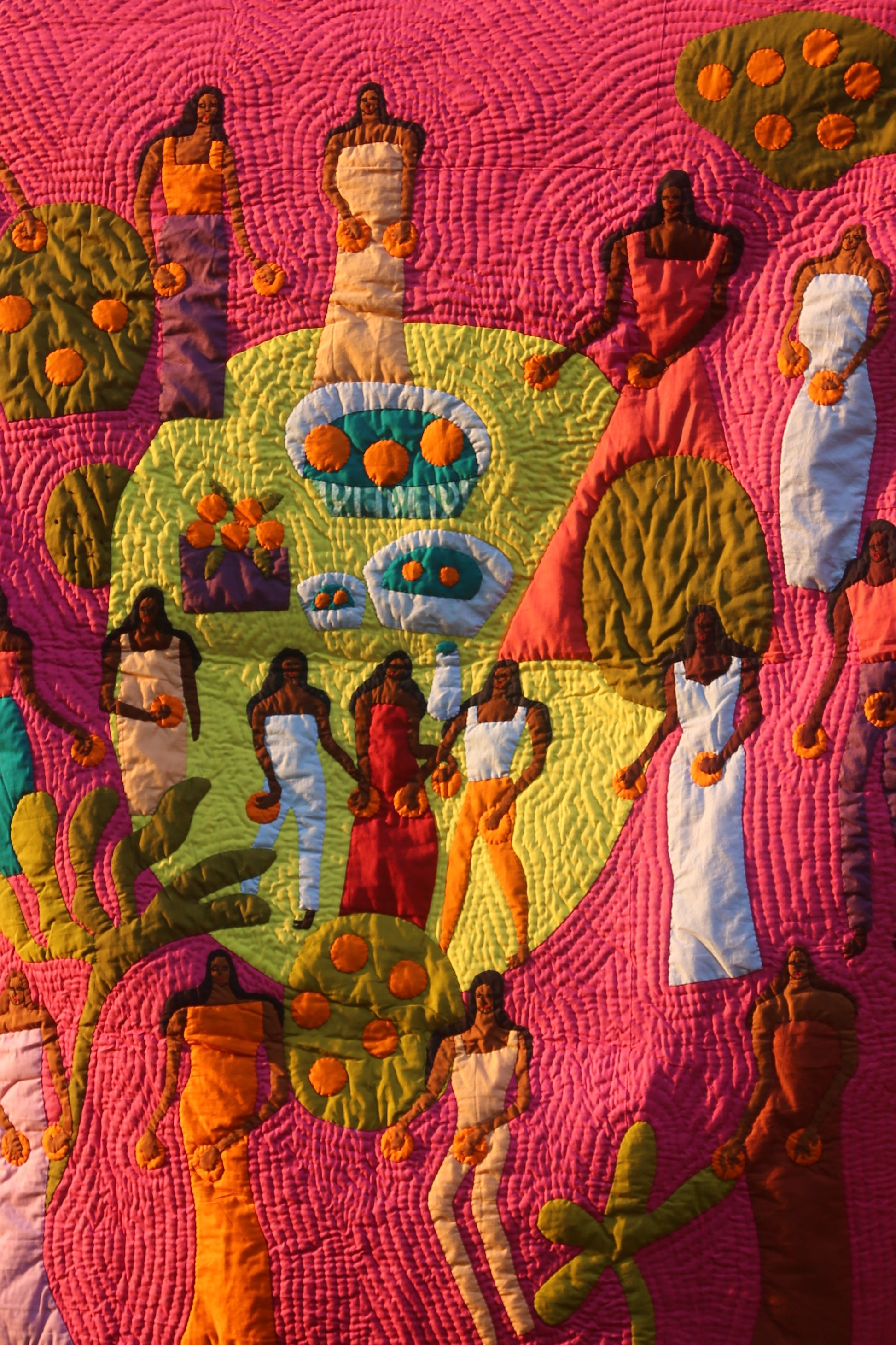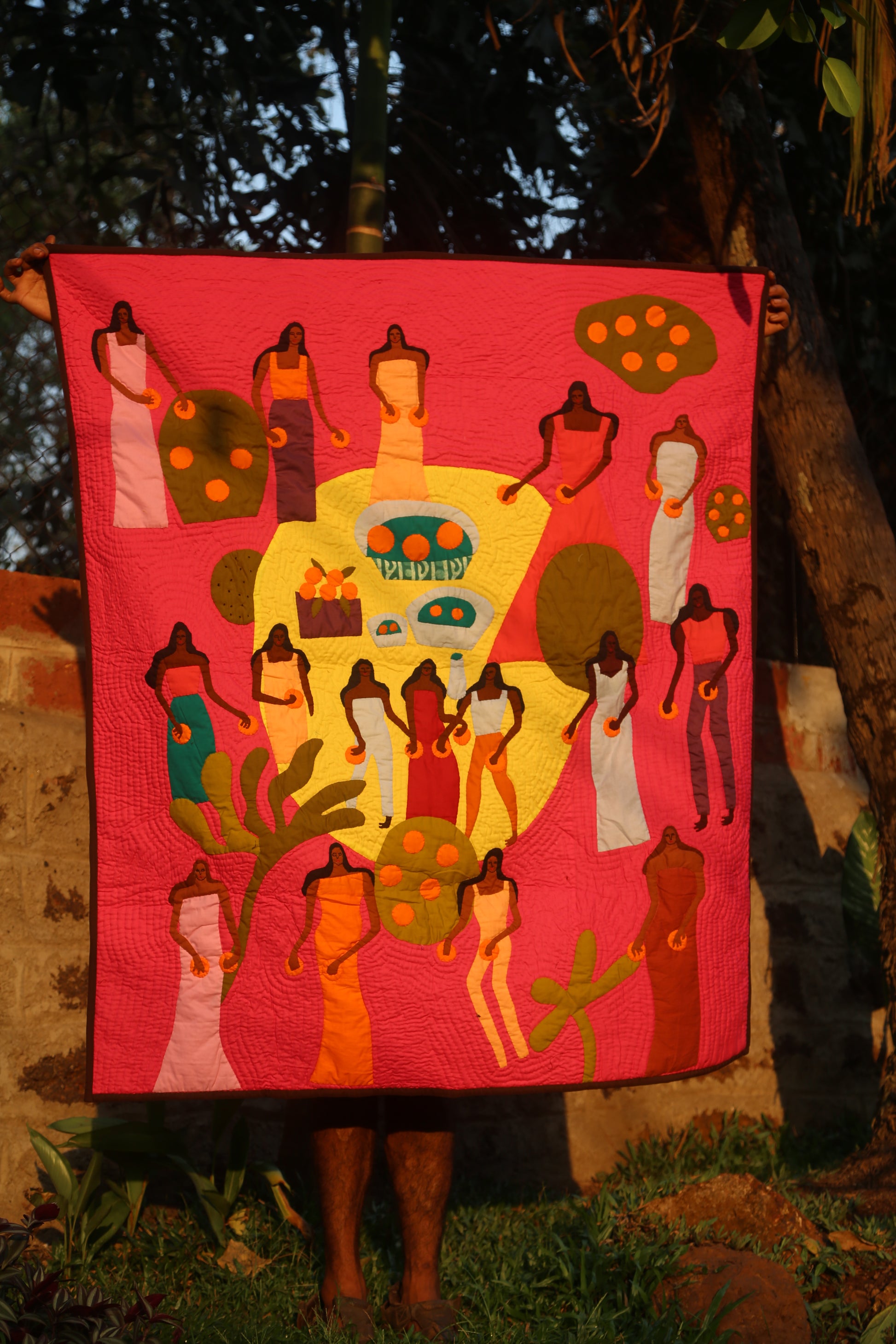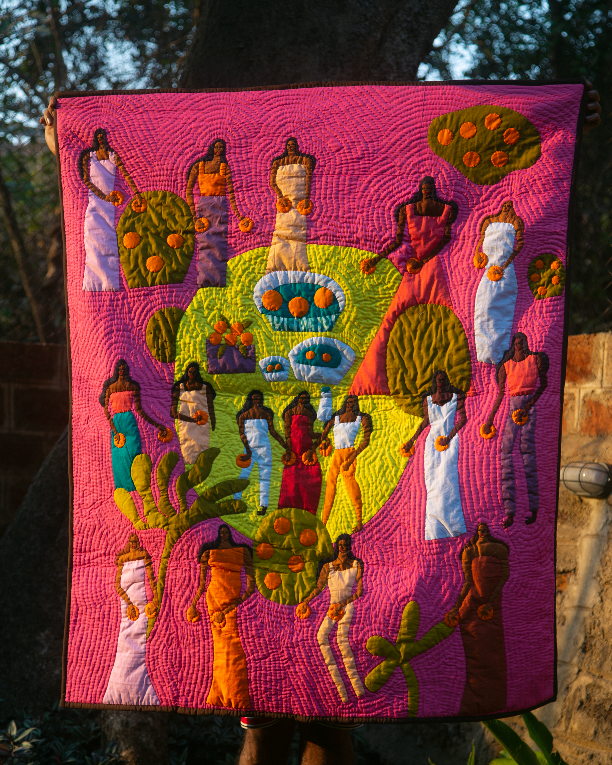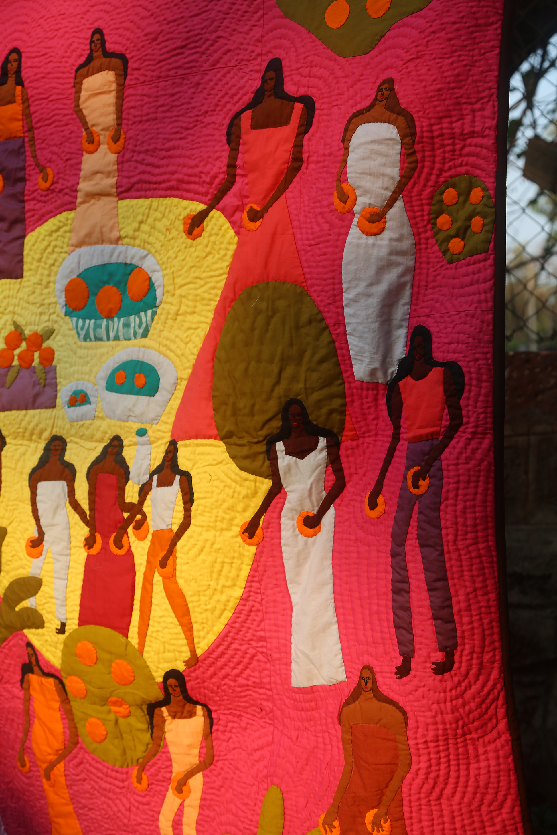 Your beloved Oranges For Everyone artwork as a quilt. Hand crafted by fabric artist Neelam di, in collaboration with Project Purkul.