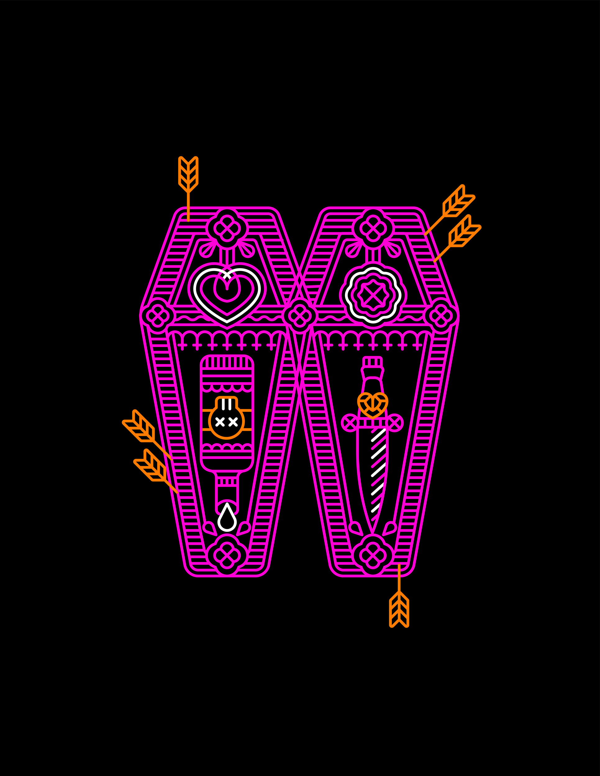 The twin coffins symbolize the lovers’ tragic double suicide. Each coffin carries the symbol of their death: poison for Romeo and a dagger for Juliet. Arrows pierce both coffins to reflect how their love was repeatedly struck by the violence of their feuding families. The rose on the right coffin evokes Juliet, while the heart on the left coffin stands for Romeo.