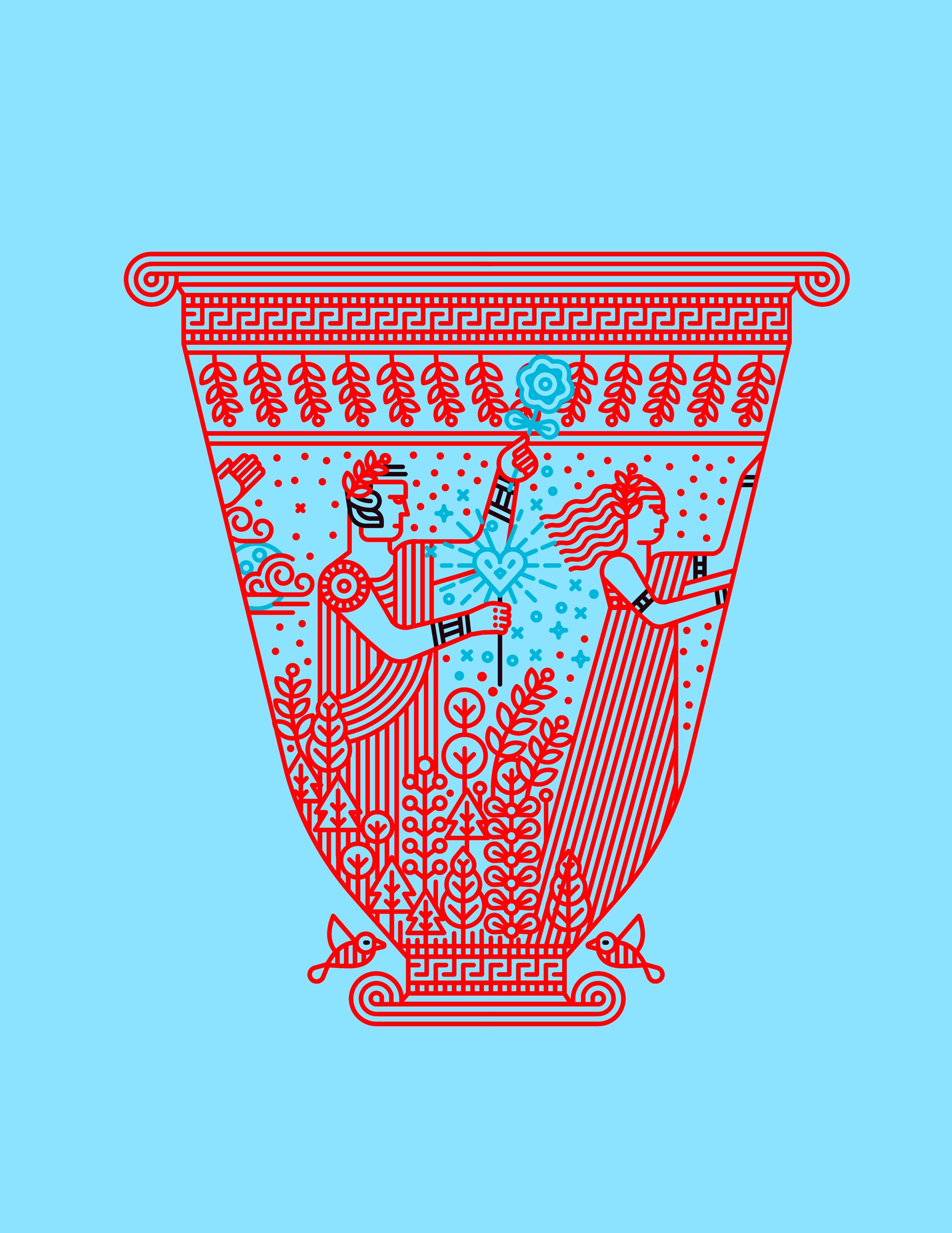 In A Midsummer Night’s Dream, the spirit of Greek comedy is symbolized by an ancient vase, while the lovers spill into the enchanted forest where desire turns upside down and everyone chases the one who wants them least, creating a whirl of magical absurdity and unpredictable possibility.
